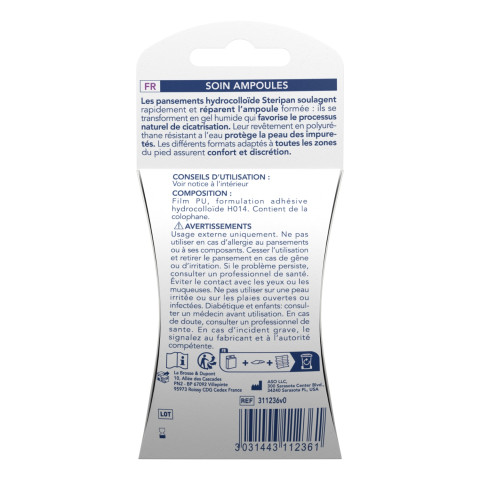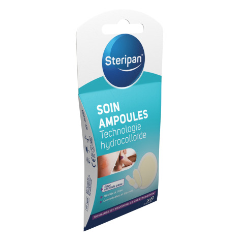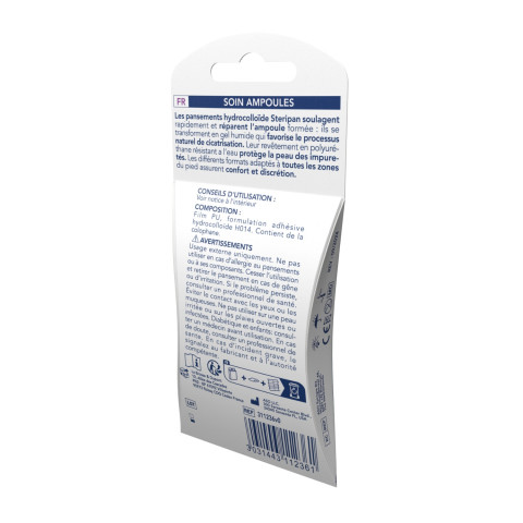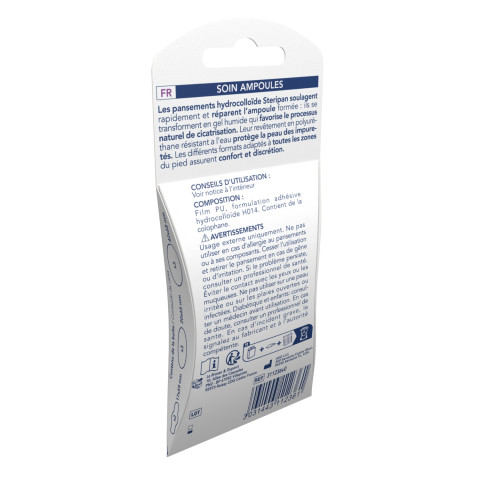 Les pansements hydrocolloïde Steripan soulagent rapidement et réparent l'ampoule formée : ils se transforment en gel humide qui favorise le processus naturel de cicatrisation. Leur revêtement en polyuréthane résistant a l'eau protège la peau des impuretés. Les différents formats adaptés à toutes les zones du pied assurent confort et discrétion.